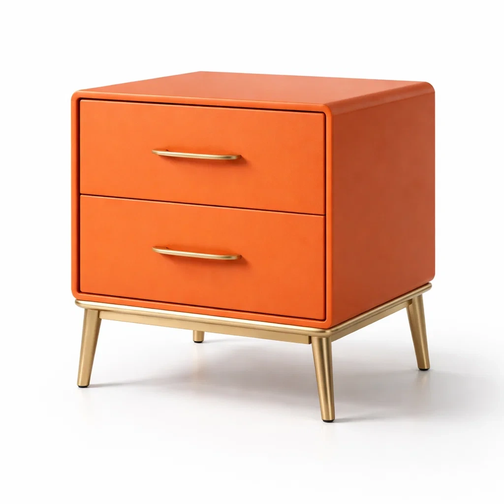 Comodino con struttura in MDF rivestito in poliuretano (PU) e gambe in metallo con finitura dorata.